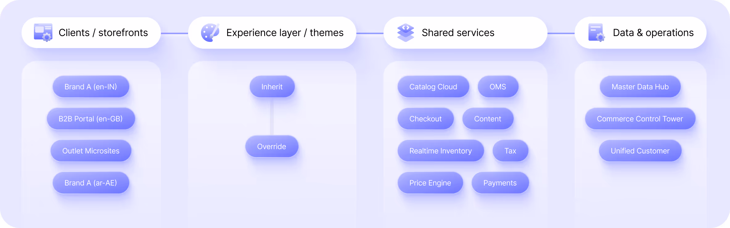Headless, API‑first, and composable. Shared services with scoped configurations